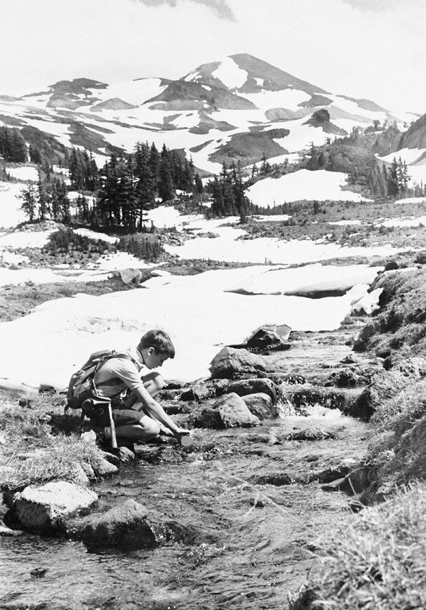 This photograph of a young hiker taking water from a stream of snowmelt in the Three Sisters Wilderness Area is from the Oregon Journal Collection at the research library of the Oregon Historical Society. The photograph’s origin is attributed to the U.S. Forest Service.