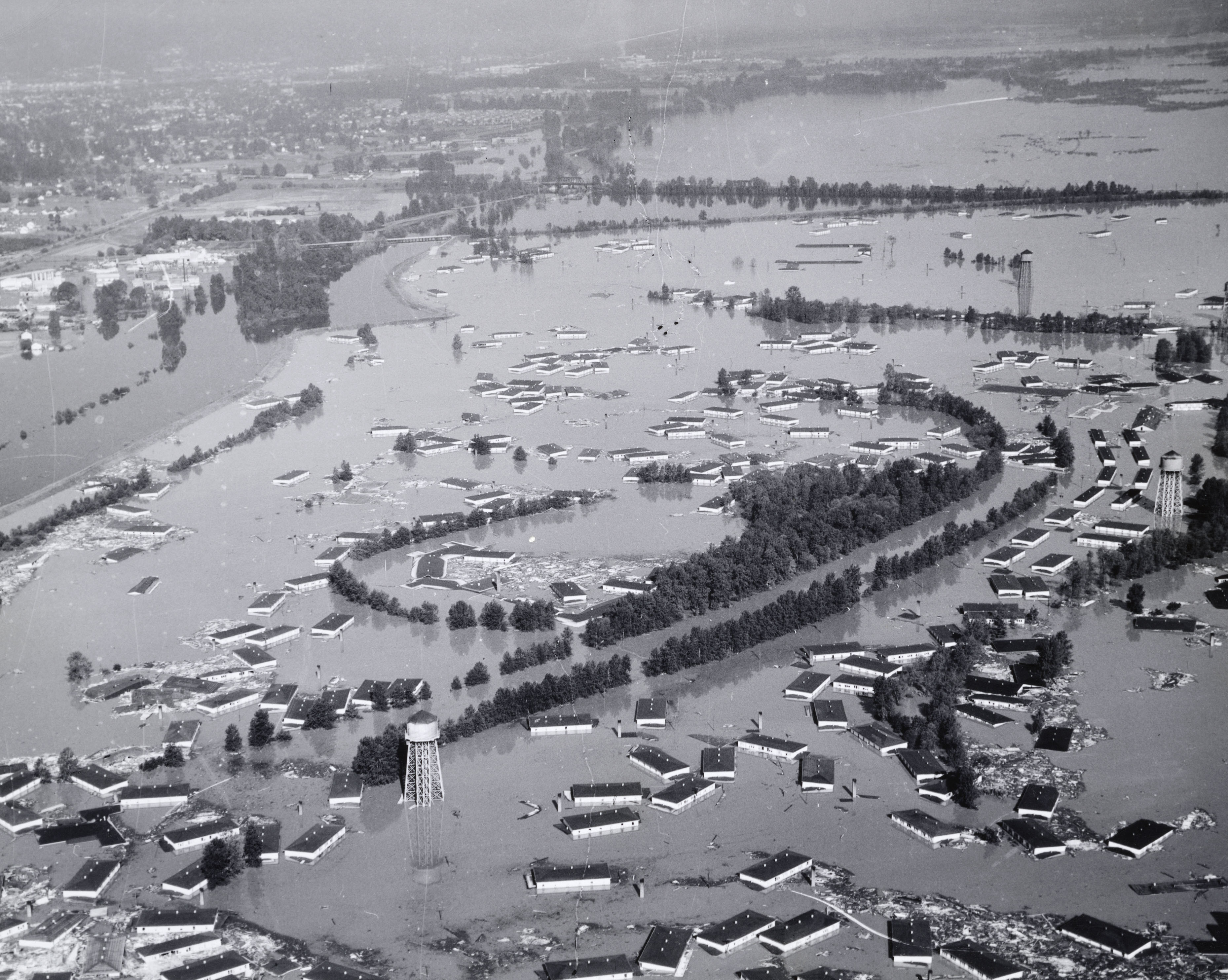 On Memorial Day in 1948, the Columbia River roared downstream fifteen feet above the flood plain in Portland and undermined a railroad embankment and dike. The flood of water left 18,000 people homeless, significantly altering race relations in Portland.