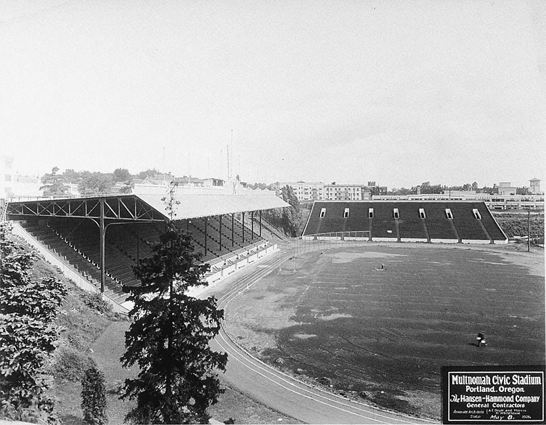 The Civic Stadium was built by the Multnomah Amateur Athletic Club (MAC) — the word “Amateur” was eventually dropped from the name. The club, which catered to Portland’s affluent families, first leased the site and built a small grandstand there in 1893, calling it Multnomah Field. They expanded the athletic field several times over the years, and finally, in 1926 added the full-scale, 28,000-seat stadium.