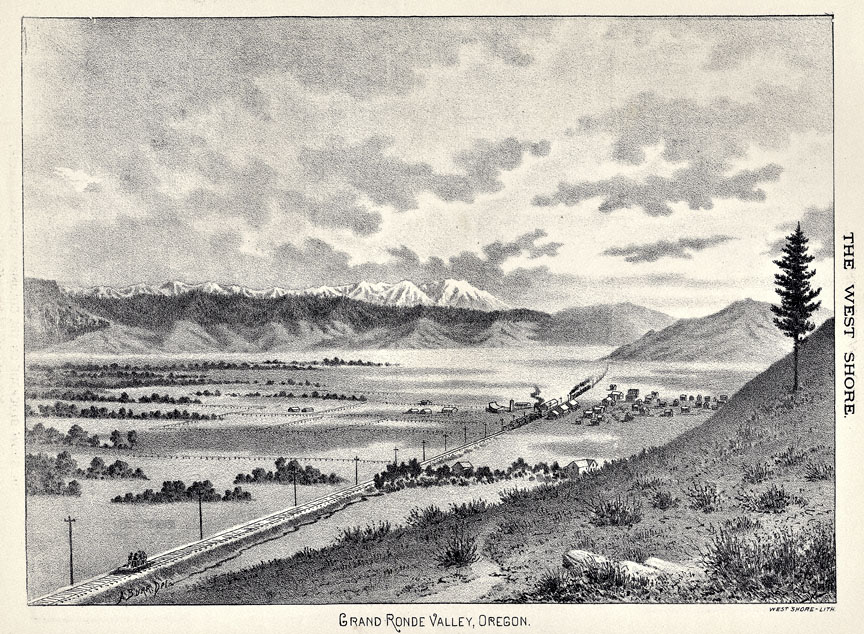 This lithograph shows a portion of northeastern Oregon’s Grande Ronde Valley as it appeared in the mid-1880s. It was published in the January 1885 issue of The West Shore, a Portland-based magazine “devoted to the development of the Great West.”
