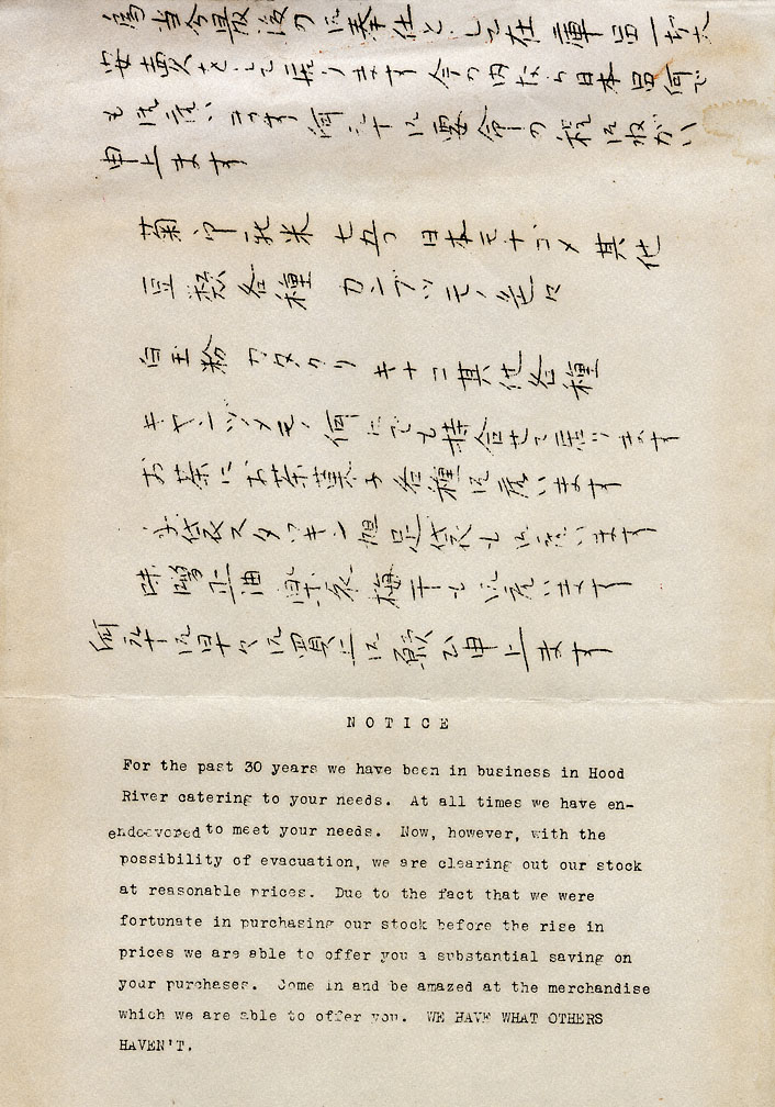 The day after Japan attacked Pearl Harbor on December 7, 1941, the U.S. Treasury Department shut down the Yasui Brothers’ Store in Hood River. Five days later, the FBI arrested Masuo Yasui, who had owned the store with his brother, Renichi Fujimoto, for more than thirty years. The United States government wrongly suspected Yasui of spying for Japan, probably because he had received a special award, a Paulownia Cup, from the Japanese government. Fujimoto posted this notice on the store in March 1942 when the government allowed him to reopen for a one-month clearance sale.